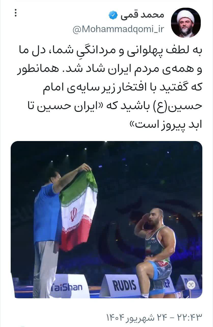به لطف پهلوانی و مردانگیِ شما، دل ما و همهی مردم ایران شاد شد. همانطور که گفتید با افتخار زیر سایهی امام حسین (ع) باشید که «ایران حسین تا ابد پیروز است.»